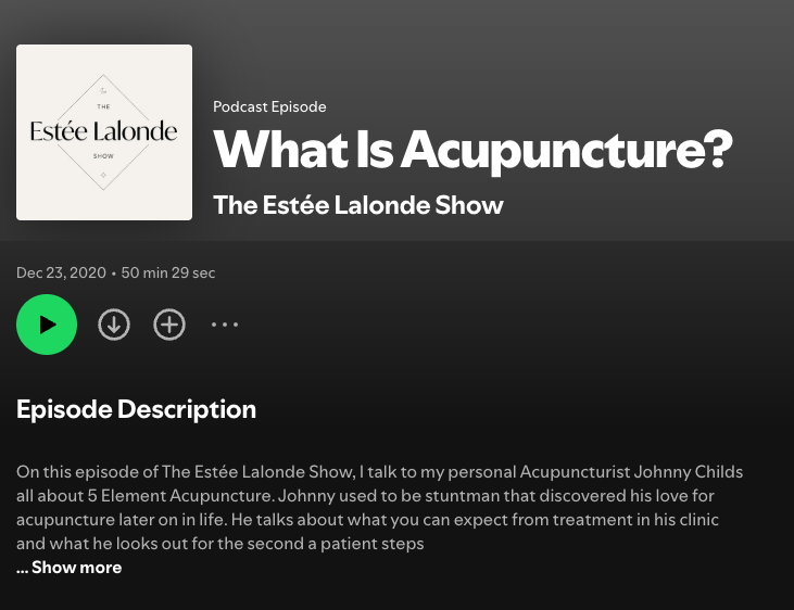 On this episode of The Estée Lalonde Show, I talk to my personal Acupuncturist Johnny Childs all about 5 Element Acupuncture. Johnny used to be stuntman that discovered his love for acupuncture later on in life. He talks about what you can expect from treatment in his clinic and what he looks out for the second a patient steps into his office.
